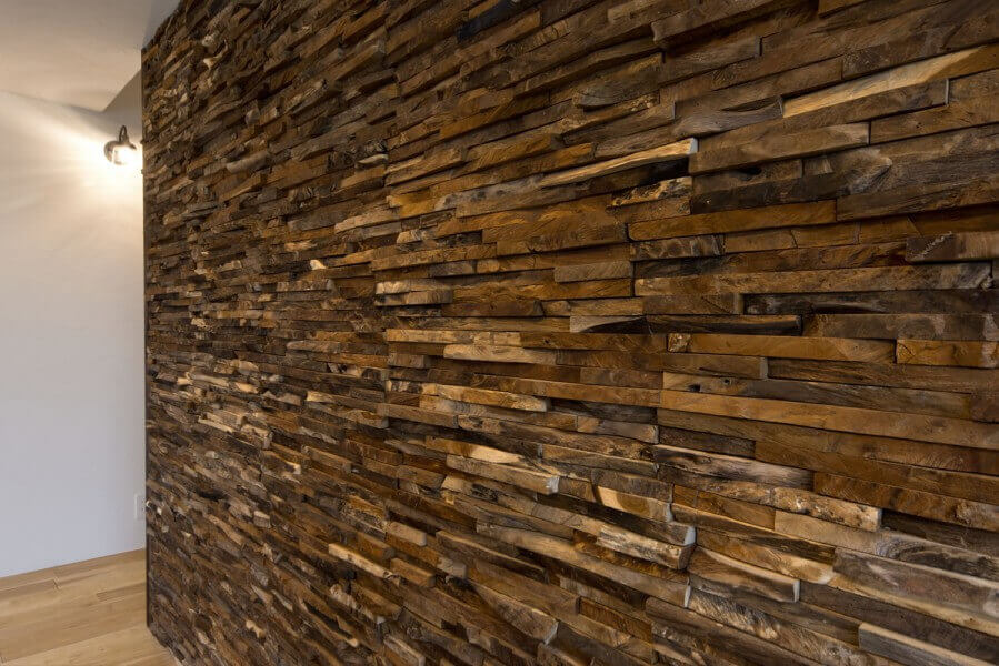 本物の木材をまるでレンガでも組み上げるかのように、壁面に張り付けています。