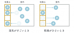 ※自然素材の珪藻土ですから、限界がありますので、極度の乾燥や部屋干しのジトジトには、加湿器や除湿機の利用をおすすめします。