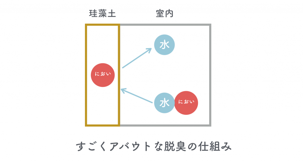 そして、先ほどお伝えした通り、珪藻土は、水分子を吸い寄せます。水に溶けて広がった臭い成分を、珪藻土が吸着します。