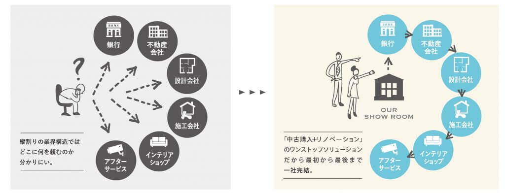 私たちリノベ不動産|BeatHOUSEでもおススメしている「ワンストップ型」リノベーション。今回はその「ワンストップ型」リノベーションの仕組みとおススメの理由をご紹介いたします。