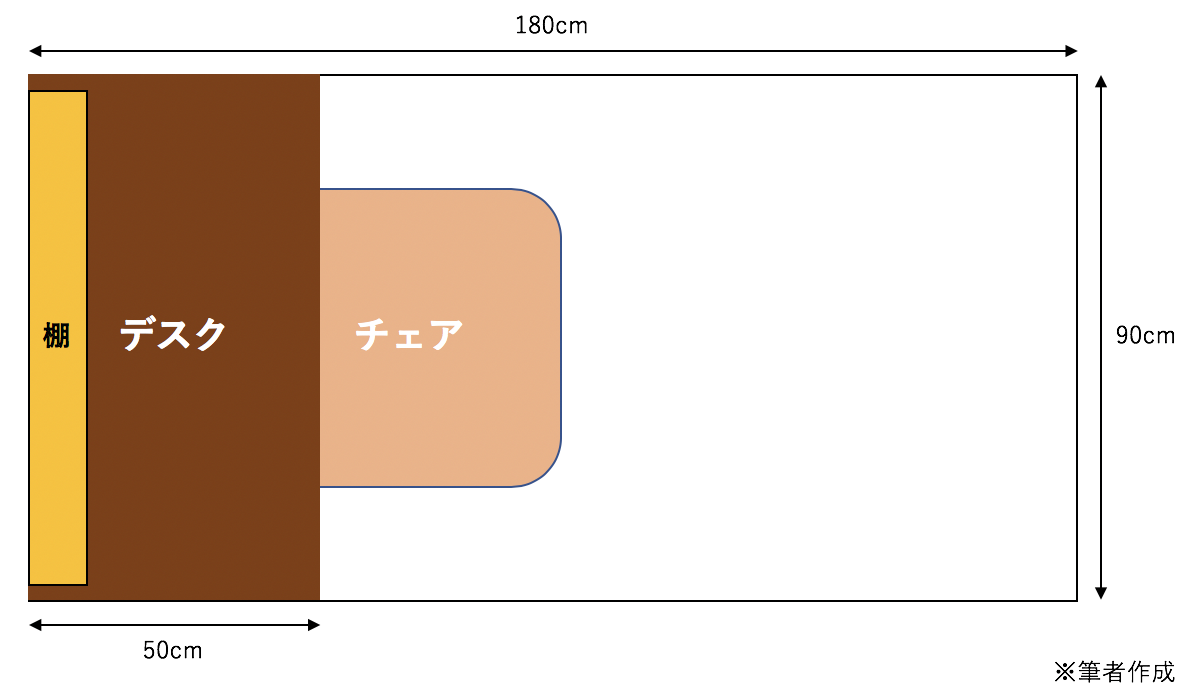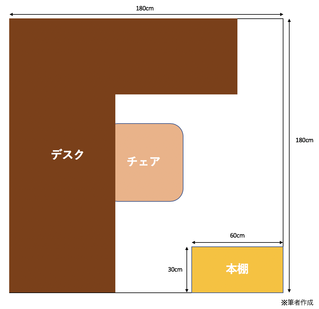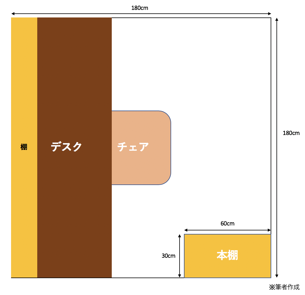 正方形に近い形の場合、上記のように幅180cmのデスクを壁際に寄せれば、後方のスペースに余裕が生まれます。図のように本棚を置くこともできますし、趣味に関連するものを置くことも可能です。